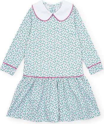 Long sleeve pima cotton dress with peter pan collar and contrast piping. Drop waist ruffle skirt. Made from 100% Peruvian Cotton.