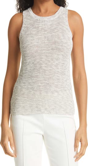 A mélange rib textures this trim sleeveless sweater that s just right for a sunny spring day.