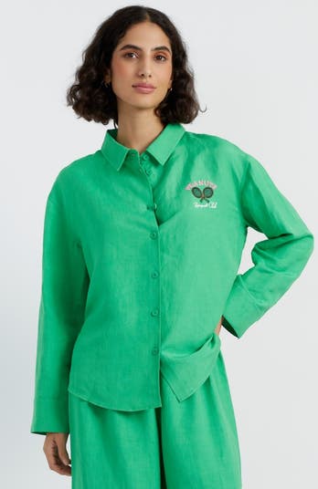 Timeless comfort meets playful charm in this elegant long-sleeve shirt from our exclusive Summer Peanuts collection. Crafted from a breathable cotton-linen blend, this piece drapes beautifully while ensuring all-day comfort. The relaxed yet polished silhouette features a button-down front, a soft collar, and a slightly longer hem for a flattering fit. A delicate, embroidered Racquet Club motif on the back adds a subtle touch of nostalgia, making it a conversation-worthy statement piece. Perfect for layering or wearing on its own, this versatile shirt pairs effortlessly with trousers or soft tailoring for a refined yet relaxed look.