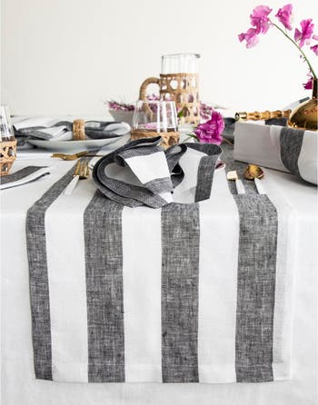 Whether you re serving indoors or poolside, the bold stripes of our Cabana Stripe Tablerunner brings any table a statement look that sets an inviting scene. Made of 100% pure linen, this tablerunner provides classic style that pairs well with your favorite dinnerware and flatware for casual entertaining. Our table runner size charts (for exact measurement): 1) One Size - 14 x 36 Inch, 2) XX-Small - 14 x 48 Inch, 3) X-Small - 14 x 60 Inch, 4) Small - 14 - 72 Inch, 5) Medium - 14 x 90 Inch, 6) Large - 14 x 108 Inch, 7) X-Large - 14 x 120 Inch, 8) XX-Large - 14 x 132 Inch, 9) Medium/Large - 14 x 144 Inch, 10) Large/X-Large - 14 x 156 Inch.