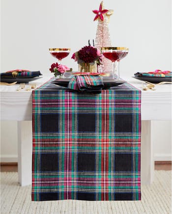 Make a festive statement on your table with our Jewel Plaid table runner this holiday season. Crafted of 100% pure linen combined with an array of beautiful jewel-tone holiday colors, this table runner will add a touch of sophistication and elegance to your Christmas or holiday table. Available in a wide variety of sizes. Our table runner size charts (for exact measurement): 1) One Size - 14 x 36 Inch, 2) XX-Small - 14 x 48 Inch, 3) X-Small - 14 x 60 Inch, 4) Small - 14 - 72 Inch, 5) Medium - 14 x 90 Inch, 6) Large - 14 x 108 Inch, 7) X-Large - 14 x 120 Inch, 8) XX-Large - 14 x 132 Inch, 9) Medium/Large - 14 x 144 Inch, 10) Large/X-Large - 14 x 156 Inch.