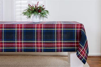 Add tradition and charm to your holiday table with our Stewart Plaid tablecloth. Inspired by Scottish design, this cheery tartan plaid tablecloth is woven of 100% pure linen makes a merry and bright holiday table.
