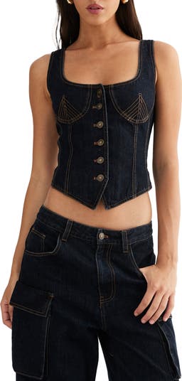 A corset-inspired top is crafted from stretch-kissed denim and features a button-up closure for a chic, on-trend look.