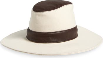 The New York–based milliner plies its centuries-old crafting techniques using unexpected materials to gorgeous, functional effect with this cotton-canvas fedora topped and banded in supple, richly grained calfskin leather.
