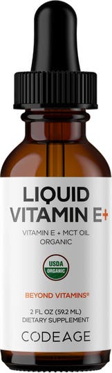 - Codeage Liquid Vitamin E+ combines Vitamin E (as D-Alpha Tocopherol Acetate) with Organic Medium-Chain Triglyceride (MCT) Oil and Organic Orange Oil Fruit.