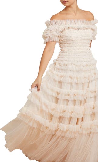 This statement gown has an elegant off-the-shoulder design inspired by Hollywood styling. Crafted with textile tulle and double-stitched frills for a dramatic, romantic effect. Features an integrated corset for a perfect fit and to hold the silhouette. Expect all eyes on you in this romantic gown.