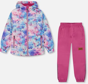 Make every outdoor play day a bit more colorful with our Printed Jacket Two-Piece Mid-Season Outerwear Set Butterflies on Multicolored and Vibrant Pink Background! Waterproof and water-repellent, this set features an allover print jacket with an attached hood, a cozy polar fleece lining, zipper pockets, and elastic wrists with adjustable cuffs. The coordinating pant features a soft elastic waistband, reinforced knees, and a soft cotton jersey lining.