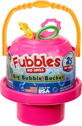 The award-winning patented no-spill design in a big bubble bucket lets 3 kids play without spilling. Great for play dates. Equipped with an easy-to-carry handle and twist-off top, it also includes three sturdy wands. The bucket holds up to 20 ounces of bubbles. Carefree bubble fun for ages 3 years old and up. Bucket size base to handle 12 inches tall. Color - pink. National Parenting Publication Honors Award (NAPPA) in 2003. Bubble solution sold separately. WARNING: CHOKING HAZARD -- Small parts. Not for children under 3 yrs.