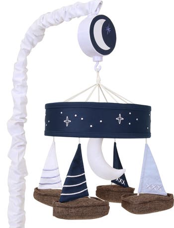 Four adorable, high-quality sailboats and one crescent moon rotate slowly around this charming nautical-themed musical crib mobile. Two sailboats are navy blue twill with white embroidery, one is white canvas with blue embroidery and one is blue chambray with white embroidery. The crescent moon in the center is textured white canvas. The decorative ring is navy twill with embroidered stars and the music box features a white crescent moon on a blue ground. The scrunchie, which covers the mobile arm, is a white textured canvas. The musical mobile plays nursery songs for 20 minutes, has an on/off switch, and volume control.