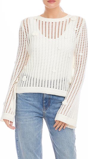 Airy open stitching makes this flared-sleeve sweater a favorite for warmer weather, and it s strewn with tonal blooms to welcome the sun.