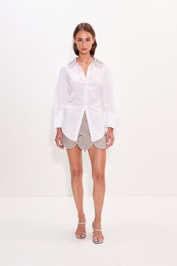 Stretch cotton poplin, with cut out back and adjustable tie for fit flexibility. Embellished sequins and bead combination. The ultimate versatile piece, dress up or down