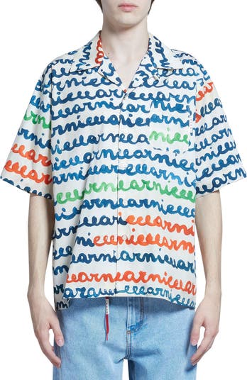 Hand–painted logo lettering stripes this cotton camp shirt cut in an easygoing oversized silhouette.