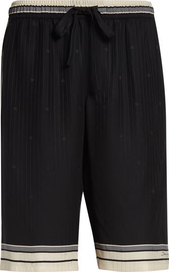 Jacquard pinstripes peppered with DG logos refine these vacay-ready Bermuda shorts crafted from fluid silk with bolder stripes ringing the elastic waist and hems.