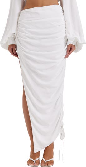Drawstring-cinched side ruching adds gorgeous texture to this lightweight, linen-kissed skirt cut to a long length with a leggy slit.
