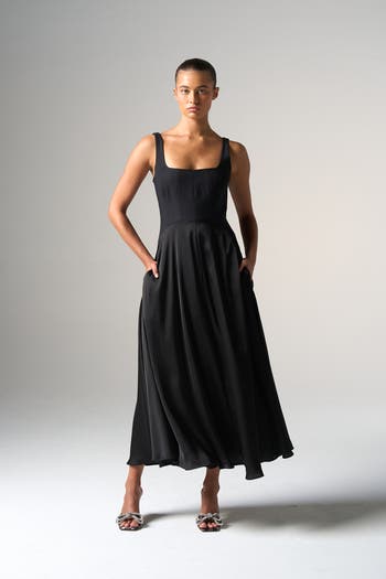 The London Dress is a timeless midi silhouette with a square neckline, wide straps, and a softly structured bodice. Designed with a fitted waist, fluid skirt, and discreet pockets, it offers understated elegance in a clean, modern finish.