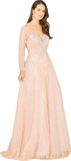 This lace gown is features beaded details throughout to create a multi dimensional look. The gown has delicate lace sleeves and an elegant v neckline that makes this dress a showstopper!