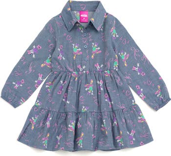 This Disney Girls Chambray Dress is perfect for your little one, from toddler to big kid. Made with soft and comfortable chambray fabric, it features a cute and colorful Disney character print with artwork of favorites like Minnie Mouse and Daisy Duck, Jack Skellington, Princesses Belle or Ariel, and Stitch and Angel from Lilo and Stitch. The shirt dress has a classic A-line silhouette with tiered ruffles, a collared neckline, and long sleeves. It also has a button closure at the front for easy dressing. Your child will love twirling around in this dress, whether it s for a playdate or a special occasion. Get this adorable dress for your little Disney fan today!