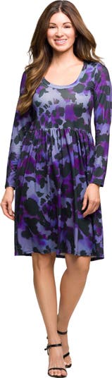 Turn heads in this purple black empire waist dress that combines comfort with effortless elegance. The gathered waistline creates a flattering drape while the scoop neckline and long sleeves keep the look timeless. Falling just above the knee, this style is perfect for both casual wear and special outings.