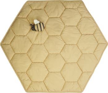The playmat Honeycomb is hexagonally shaped and quilted in the characteristic honeycomb pattern. Made of soft organic cotton poplin in Honey color, and filled with soft recycled polyfill, the play mat comes together with a charming bee rattle toy with crinkle paper inside.