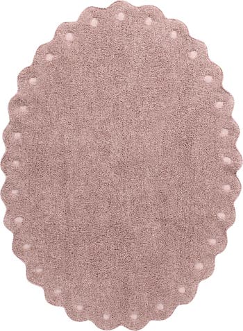 Oval cotton rug inspired by the shape of a Pine Cone. The rug is made in mix of Vintage Nude and Linen color yarns, presenting rounded edges all around with bare spots showing the Vintage Nude canvas base.