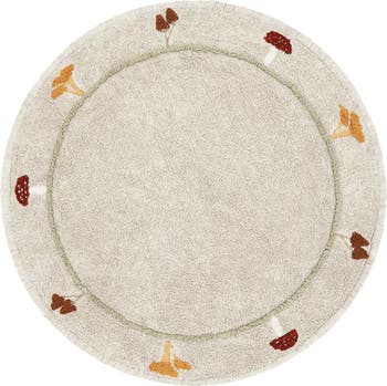 The round Chanterelle rug is decorated with a border of different mushroom species such as chanterelles and morel mushrooms, combining patches of canvas with tufted patterns. The rug has a natural base, an inner circle of slightly longer pile in Olive and design details in Honey, Burgundy, Toffee and Ivory
