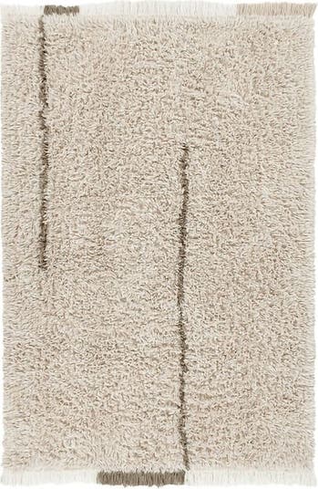A fluffy, long pile rectangular wool rug, in Natural color mixed with Sandstone and with contrast lines in Almond Frost. Uneven fringes at edges gives the rug a bohemian, hippie look A cotton tote bag and a non-slip underlay are included with every rug.