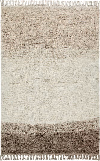 Medium pile rectangular wool rug in soft colors shades of Sandstone, Natural and Almond Frost. Finished with handmade cross-knotted wool fringes at edges A cotton tote bag and a non-slip underlay are included with every rug.