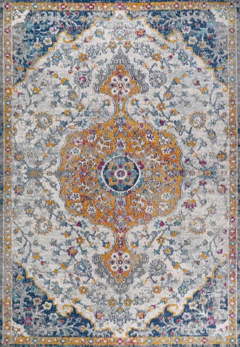 This vibrant medallion rug s traditional pattern adds Bohemian style to a living room, bedroom, entry or kitchen. Navy, orange and gray vines and flowers on an ivory background give this rug a hand-woven, vintage vibe. The busy allover pattern is pet-friendly and great for kids too.