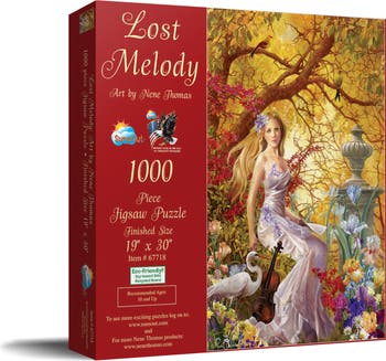Immerse yourself in the enchanting world of Nene Thomas through the 1000 piece Lost Melody Jigsaw Puzzle by SunsOut Puzzles. This captivating scene, featuring an exquisite blend of fantasy and nature, transforms into a stunning 19" x 30" piece of art. The puzzle pieces are crafted with precision and care, made from premium recycled cardboard and soy-based inks, reflecting a commitment to quality and eco-friendly manufacturing. SunsOut’s interlocking design ensures a secure fit at every connection, creating a beautiful and durable puzzle while reducing environmental impact. As part of a woman-owned brand proudly made in the USA, each SunsOut Puzzle boasts vivid, fully licensed images by renowned artists and uses premium recycled board, making every purchase a sustainable choice and a celebration of female entrepreneurship. Additionally, your mind can rest easy with our worry-free guarantee, assuring any issues with missing or damaged pieces will be promptly resolved, reflecting our steadfast commitment to quality and customer service. The Lost Melody Puzzle by SunsOut provides an artistic avenue for escape into fantasy, promoting hours of creativity, challenge, and satisfaction. Unlock a realm of beauty, mystery, and fantasy with the Lost Melody Puzzle and revel in the stories told through each intricate piece.