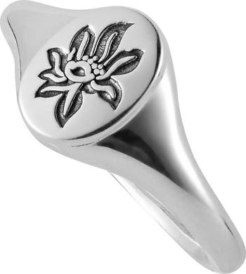 The Lotus flower symbolizes creation, birth, purity, virtue, and enlightenment. Lotus flowers grow in muddy waters, and yet have such fragrant, astonishing beauty. Lotus flower patterns are used on palace decorations, as well as in daily life for cooking, brewing tea, and fibers to thread. Designed as a signet ring with a lotus flower engraving, the Lotus Signet Ring represents the rebirth of a childhood and new beginnings. It’s an encouraging reminder to stay strong and positive. | o Signet Face Approx. 10 mm x 7.5 mm o AG 925 Sterling Silver o Finish: Polished o Nickel free o Handcrafted in Korea