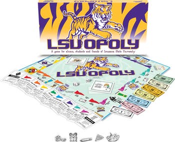 The LSUOPOLY board game is perfect for LSU alumni, students and future grads. Game includes alarm clock, pencil, gym shoe, bicycle and graduation cap tokens as well as popular campus and off-campus locations for board spaces such as Thomas Boyd hall, Middleton library, Alex box, Indiana mounds, the pastime, the chimes and Dalrymple drive. It also includes relevant contingency cards.