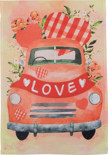 Show your love this Valentine s Day with this garden flag. It will add a pop of vibrant red color to your outside decor. Perfect to display year after year. Features: Valentine s Day garden flag Reads "LOVE" on a red banner decorating a car Features a red vintage car, hearts and flowers A soft, high-quality fabric for durability Sleeve on top allows the flag to slide onto the flagpole Double-sided design Care instructions: Handwash in cold water with mild soap. Hang dry. Use cool iron if needed Dimensions: 18" long x 12.5" wide Material(s): polyester Note: Flagpole is not included