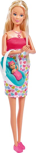Steffi is expecting a baby, the doll s sound functions will provide a lot of fun. Press the heart-shaped doll s necklace to listen to the heartbeat of an unborn baby. During the baby s arrival, we will hear the baby s cry announcing his health and happiness of the young mother - just press the necklace again. In order to hear the sounds of an amused newborn in the arms of a mother or a calming lullaby, close the abdomen by turning over the inserted tab and press the necklace one after the other. The doll has folded arms at the elbows and wrists, a baby carrier and accessories for the care of the newborn are attached, try-me function. This set includes Steffi, her baby, and 4 accessories: blanket, cap, teddy, and baby seat.