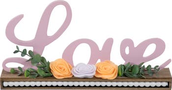 Elevate your space with this enchanting wooden tabletop sign. Crafted with a wood base, this charming piece features the word "Love" in delicate script font. Accented with artificial flowers, this sign merges the beauty of love with the serenity of nature, making it a perfect accent for any room or occasion. Product Features: Wooden tabletop decorative sign Sign reads "Love" in a pink cursive font Accented with artificial flowers and green leaves Base comes with a white beaded look accent For indoor use only Dimensions: 6"H x 11.25"W x 2"D Material(s): wood/fabric/plastic