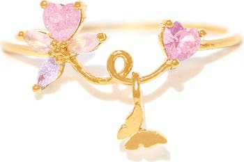 A butterfly charm floats on this whimsical ring glinting with cubic zirconia.