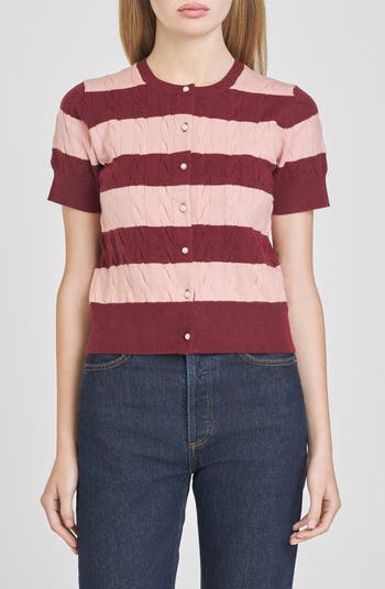 Bold stripes and chunky cables define a between-seasons cardi knit from a wool-kissed blend and served with short sleeves.