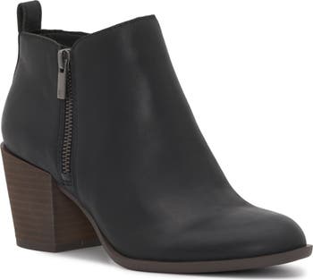 Dual side zippers and a rear pull tab lend easy wear to a versatile bootie balanced by a plain toe and stacked block heel.