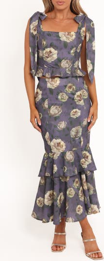 A fluttery peplum on the cropped tank stylishly corresponds with the tiered-ruffle skirt of this chic floral-print set that s perfect for weekend outings.