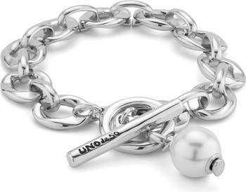 - Sterling silver-plated or 18K gold-plated link bracelet with a pearl