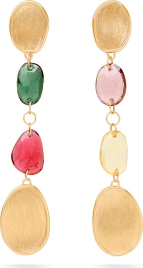 Petal-shaped beads of hand-engraved 18-karat gold and rainbow-hued tourmaline lend generous color and gleam to these mismatched drop earrings.