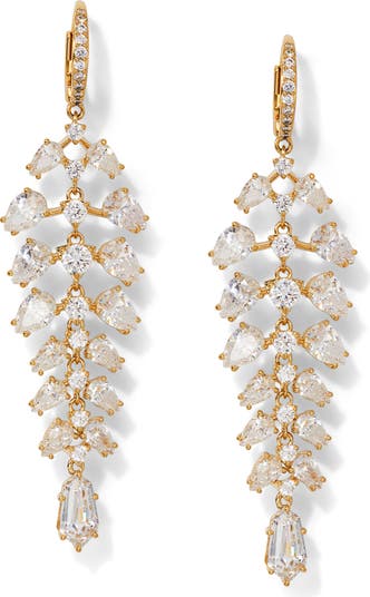 A hinged designed brings swinging mobile-inspired movement to drop earrings prong-set with cubic zirconia and plated in 18-karat gold.