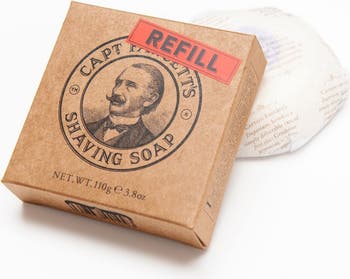 No need ever to run out of the Captain s preferred Shaving Soap with this eco-friendly refill! This shaving soap is designed to fit neatly into the Luxurious Shaving Soap Wooden Bowl.Refreshing top notes of Pine Needle, Elemi, Cumin Coriander yield to an exotic blend of Frankincense, Patchouli Tobacco, magnificent against a backdrop of Sandalwood Amber.Soap British made.Quantity: 110g / 3.8ozNB: Wooden bowl NOT included when purchasing this shaving soap refill.