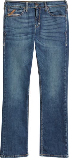 Heavy whiskering and fading through the wear points create a well-loved look for these slim-cut jeans constructed from hyperstretchy cotton denim that recovers and retains its shape wash after wash.