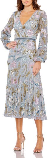 Elevate your style with our Long Cuff Sleeve Embellished Midi Dress. Perfect for formal events, it features intricate embellishments and a sophisticated silhouette.
