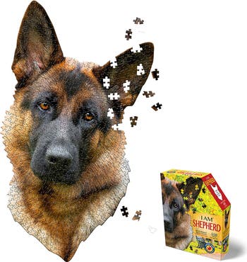 MADD CAPP: I AM SHEPARD - Lean on Me! Unique, animal head-shaped, 550-piece jigsaw puzzle for ages 10 and up. Finished size: 19" x 32" (poster size). Each puzzle comes with an educational Madd Capp Fun Facts booklet. On one side is a fold-out puzzle image to hang as a poster or use as a reference. The flipside is chock-full of cool information! Did you know, for instance, that when you give a shepherd a command, 95% of the time they ll get it right, right away? They re brainiacs – the third smartest dog breed, behind the border collie and the poodle! 550 INTERLOCKING PUZZLE PIECES: Animal head-shaped border. No square corners, no square edges… just a little extra challenge and a lot more fun. Semi-gloss, photo-realistic animal image. Mounted on premium quality chipboard (dust free!). Random cut, interlocking puzzle pieces are thick and sturdy and hold up to repetitive use. Puzzle pieces come fully separated with cleanly cut edges that fit together snugly. Makes amazing wall décor. Glue it, then mount the masterpiece! Sustainably sourced and recycled materials. PACKAGED in Madd Capp’s signature five-sided box – durable, tamperproof, and sized just right to secure 550 puzzle pieces. Box size: 10" x 12" x 3". Includes Madd Capp Fun Facts booklet and full puzzle image.