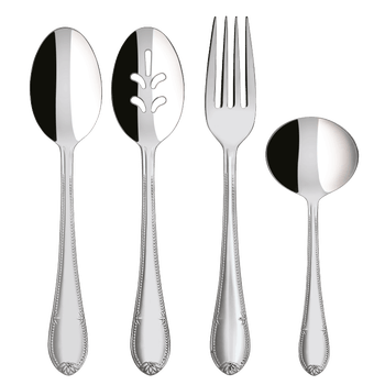 The attractive pearl details add a youthful and fresh feel to the classic design of the traditional Mademoiselle collection. The rounded shape makes each individual item feel very comfortable in your hand. The attractive stainless steel cutlery with classic design elements on the edges creates a very striking effect.This 4 piece serving set is the perfect way to complete your table set. 18/10 Stainless steel for rust resistance, strength and durability. Dishwasher safe.