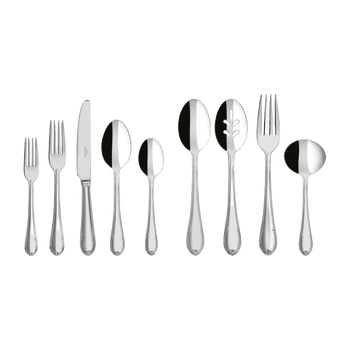 The attractive pearl details add a youthful and fresh feel to the classic design of the traditional Mademoiselle collection. The rounded shape makes each individual item feel very comfortable in your hand. The attractive stainless steel cutlery with classic design elements on the edges creates a very striking effect.The 64 pc service for 12 includes 12 each:Dinner Fork, Salad Fork, Soup Spoon, Dinner Knife, and Teaspoon. Plus a 4 piece serving set. 18/10 Stainless steel for rust resistance, strength and durability. Dishwasher safe.