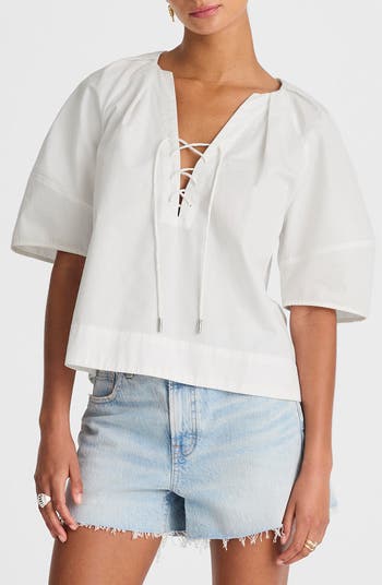 Crafted from crisp cotton poplin, this top has a pleated lace-up neckline and voluminous balloon sleeves. Light, airy and perfect all season long.