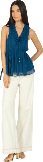 Crafted from airy silk chiffon, this top features a flouncy ruffled neckline with adjustable ties and empire waistline for a touch of romance.