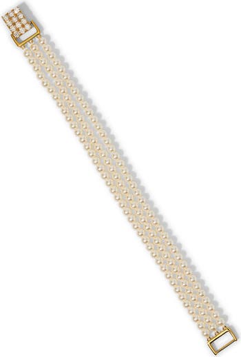 Add an elegant glow to your occasions with this layered bracelet featuring three fauc-pearl strands and pavé cubic zirconia.